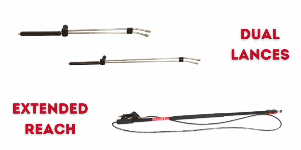 Wand length matters, and extended reach wands and dual lance wands help you get the job done much faster. Extended reach wands help keep you safe, too, by providing better access for jobs where you might otherwise need to get on a ladder or scaffold. With something like a Giraffe extension wand or telescopic wand, you can clean homes, office buildings, gutters, and large equipment with greater ease and peace of mind.